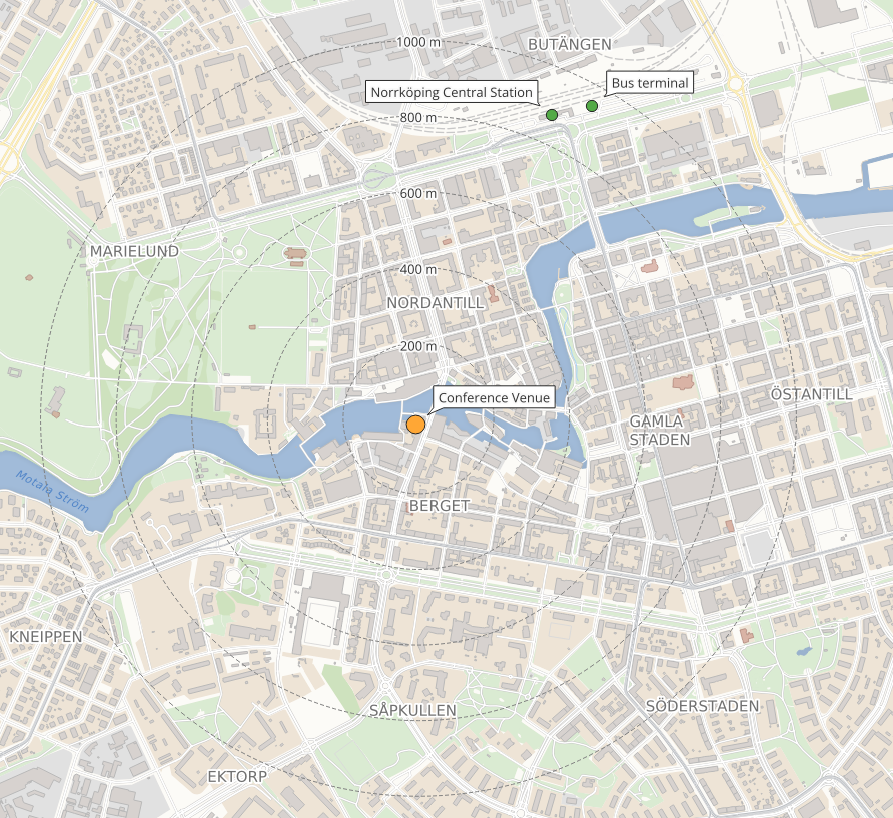 Linköping City Airport (LPI) is 45 km away and has regular connections to Amsterdam with KLM. From Linköping City Airport to Norrköping you can get a taxi for around 1250 SEK, the ride can be bought from the driver or by ordering in advance by calling +46 13 30 30 30. If going by taxi we recommend going with other participants to share the cost and reduce the impact on the environment. The travel time is around 30 minutes.